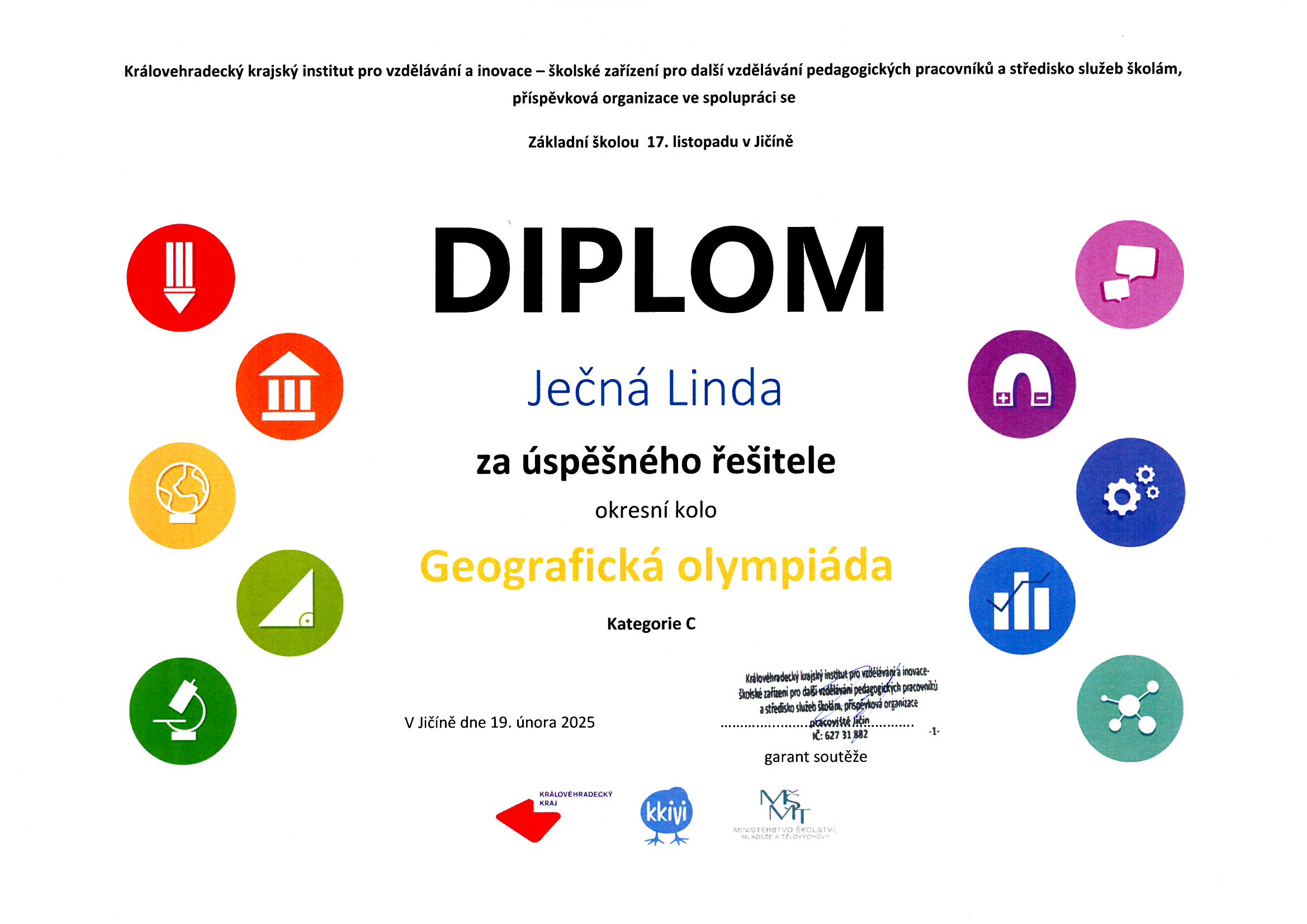 Geografická olympiáda - Linda Ječná - úspěšný řešitel.jpg